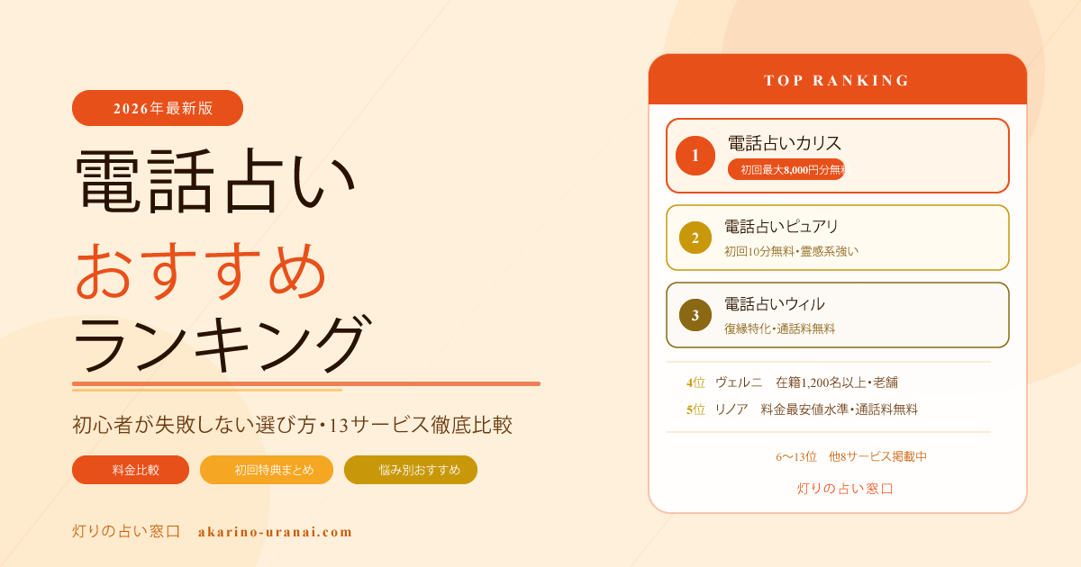 各サービスの初回無料特典の詳細・使い方・注意点については、電話占い初回無料おすすめ10選【2026年最新】で詳しく解説しています。